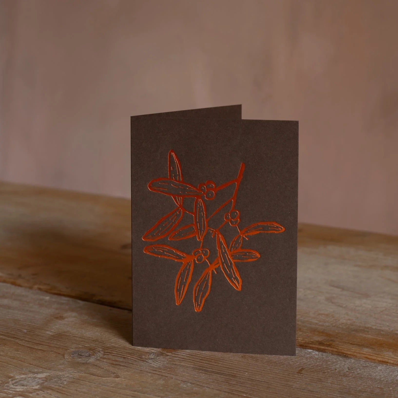 This Mistletoe Christmas card is printed on high-quality 300gsm UK-made coloured card stock, featuring a stunning recyclable foiled design. Each card is crafted with precision using a vintage 1920s Heidelberg press, ensuring a sharp, crisp finish.