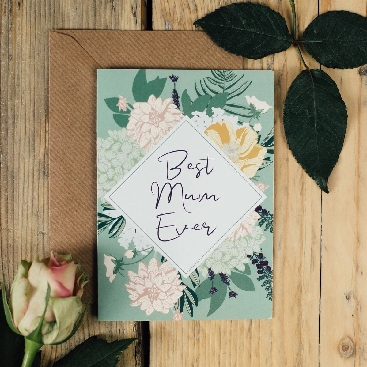 A pretty mint green card with blush pink and soft coloured florals framing the phrase 'Best Mum Ever'. Celebrate Mum's birthday or Mother's Day by telling her she is the best!