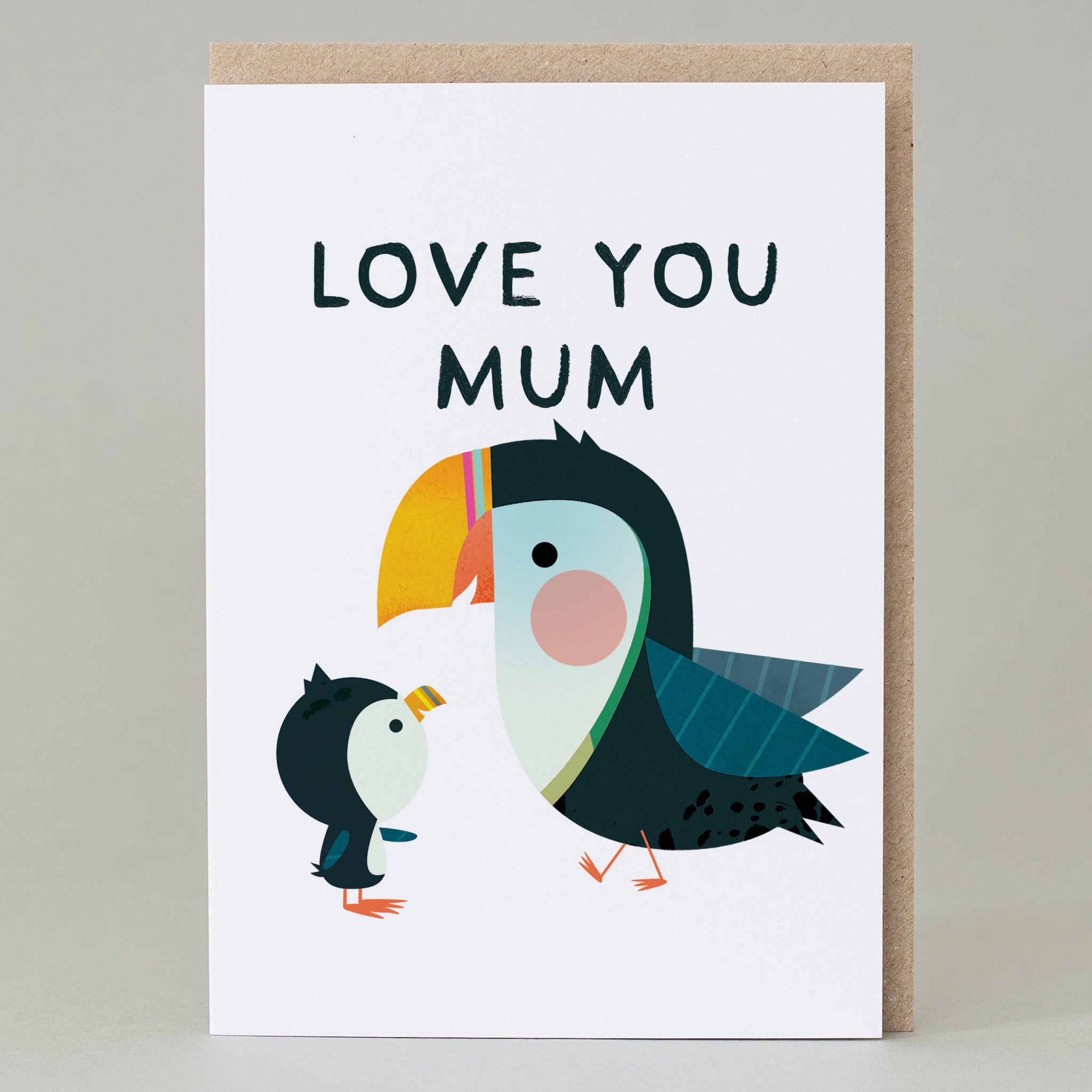 A baby puffin looks up to their mum and says 'Love you Mum'. A sweet card for a little puffin to give to their mum on their birthday or Mother's day.