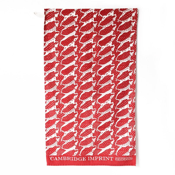 A tea towel with a dog pattern on a striking red background. These tea towels are printed and sewn in Suffolk.