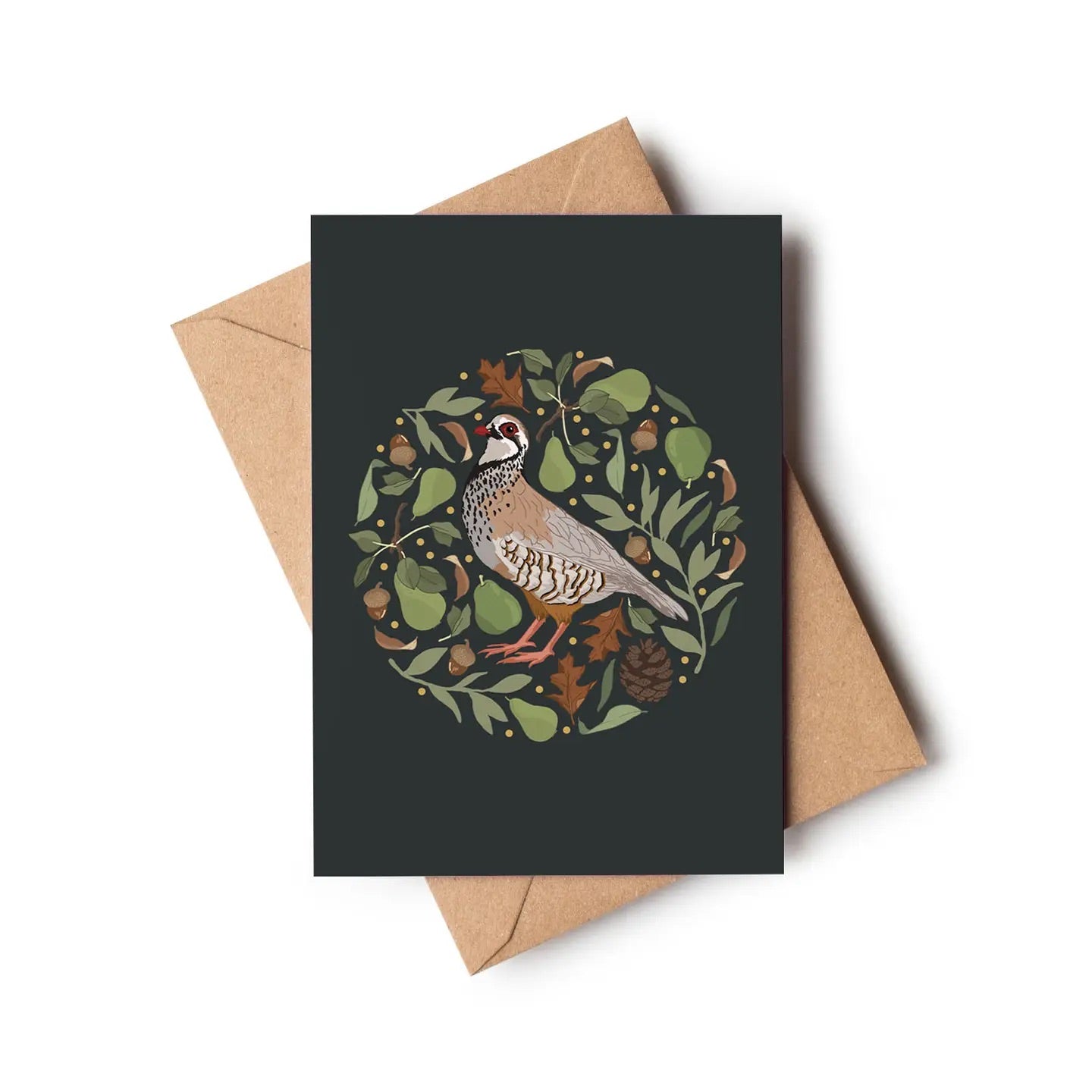 A modern floral take on the twelve days of Christmas song. A beautifully illustrated partridge surrounded by pears and olive green foliage in a circular design, finished on a rich deep blue background, a perfect, classic, card for a cosy Christmas.