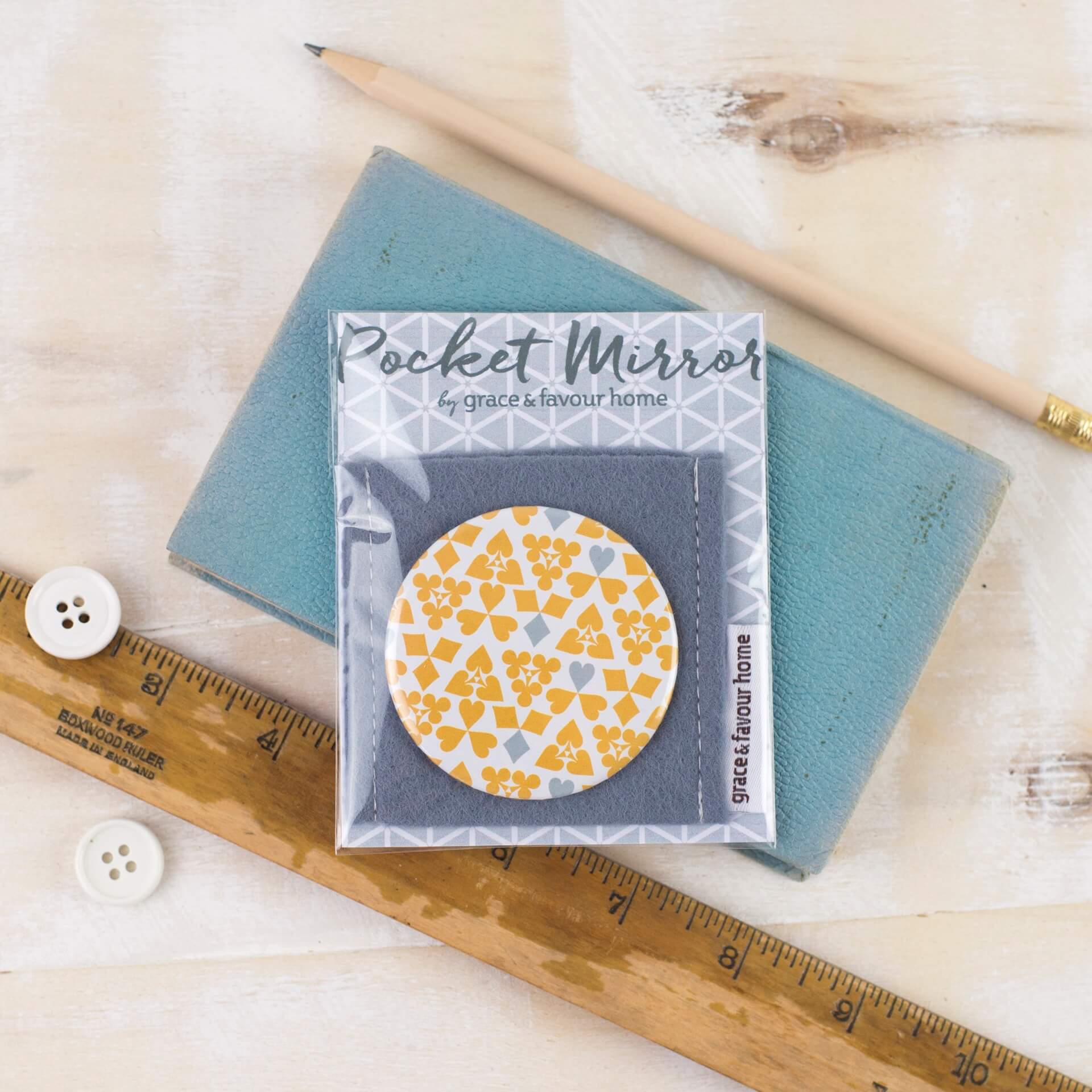 Fun pocket mirror in our own 'Suits' design with felt storage pouch. A thoughtful little gift or useful everyday handbag mirror. These mirrors are handmade in our Devon studio and feature our striking 'Suits' design in ashade of mustard with grey accents Measuring approx 6cm across, the mirrors are supplied with a grey felt pouch to keep them safe. These make great wedding favours - a magnetic bottle opener in the same design is also available for the men! Please see our other items for details.